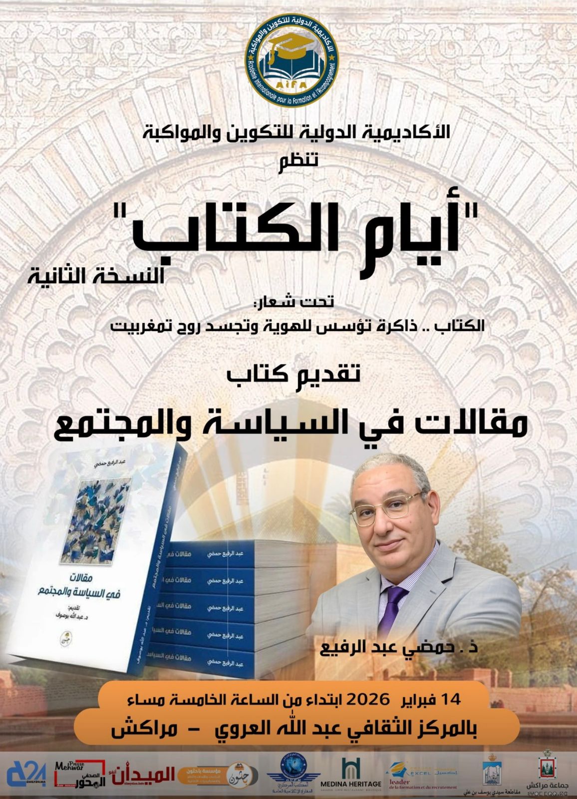 تستعد الأكاديمية الدولية للتكوين والمواكبة لتنظيم لقاء ثقافي وفكري بارز يوم السبت، يخصص لتقديم وقراءة كتاب "مقالات في السياسة والمجتمع" لمؤلفه الأستاذ عبد الرفيع حمضي.