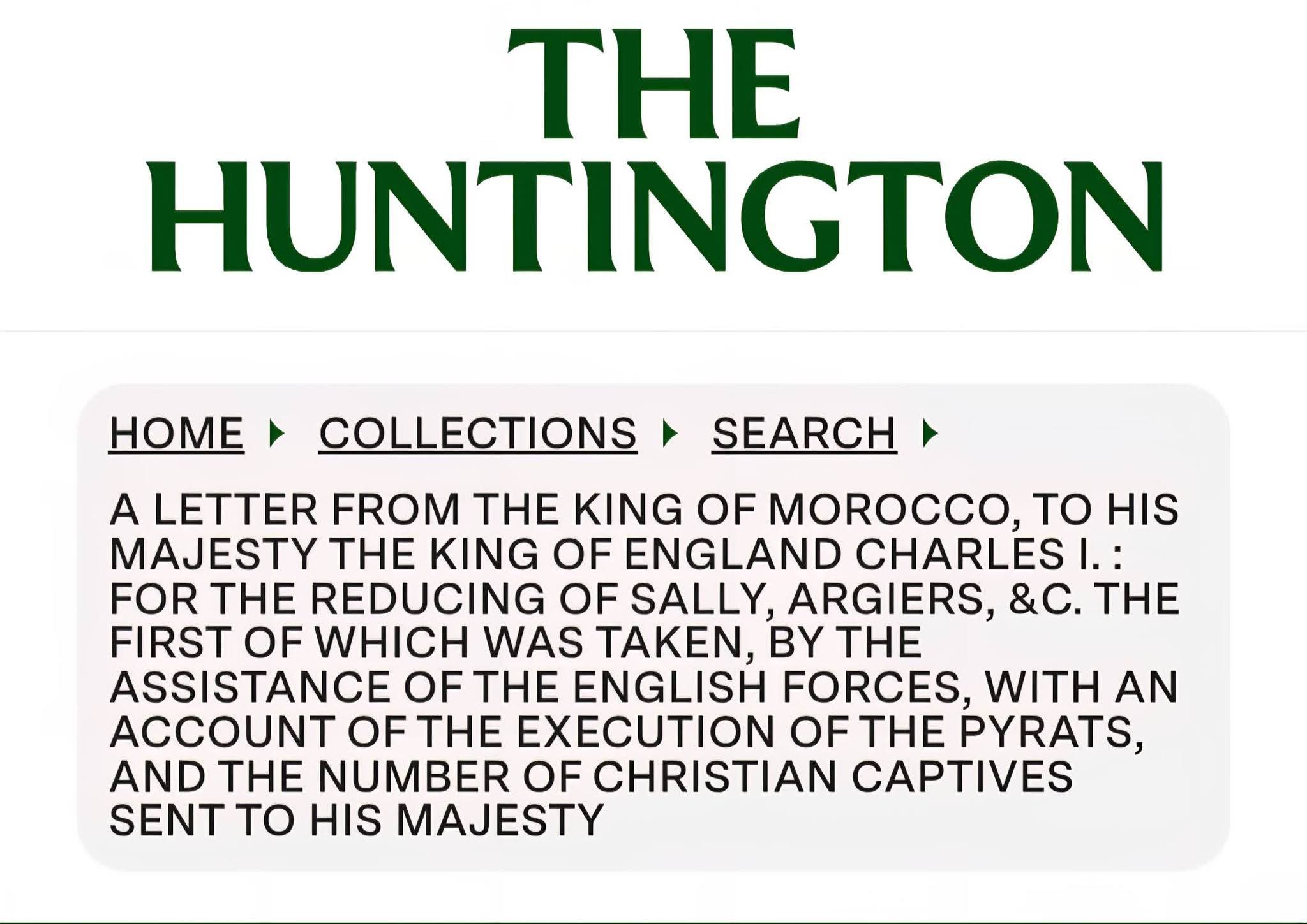 🔹️مكتبة هانتينغتون (The Huntington Library): وثيقة رقم (432925)، مراسلات القرن السابع عشر حول نفوذ "Argiers" و"Sally".