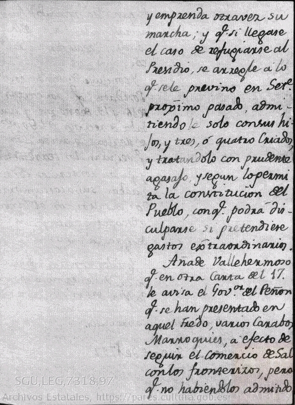"...pues sucediendo lo q.e indica se executó en el año de 1770. con Muley Aly, se tocaria un inutil expendio de Polvora, ocasionandose asimismo deterioro à la Fortificazion... deverà arreglarse à lo prescripto en la Real orden... para q.e lo admita con sus hijos, y tres, o quatro Criados, y tratandolo con prudente agasajo... con q.e podrá disculparse si pretendiere gastos extraordinarios".