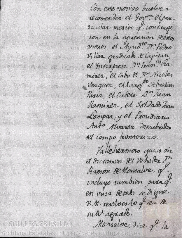 لقد قرأتُ على الملك رسالة سعادتكم المؤرخة في 31 من الشهر الماضي، والتي تتضمن نسخة من الرسالة التي كتبها حاكم "الصخرة" (Peñon) بتاريخ 23، بخصوص الطلب الذي قدمه قائد القصبة باسم الشريف مولاي إبراهيم، ملتمساً تسليم المغاربة الأربعة الذين أُسروا في العام الماضي أثناء نوبتهم في الحراسة بالنقطة المسماة "البابة"، وذلك مقابل قطيع من الماشية. وبعد اطلاع جلالته على كل الحيثيات، وعلى ما أفاد به المراقب (Veedor) دون رامون دي مونسالفي، قرر جلالته أن تنتظر سعادتكم الأوامر التي سيبلغكم بها السيد "كونت دي أراندا" بهذا الشأن؛ وهو ما أنقله لسعادتكم بموجب أمر ملكي للإحاطة والعلم. حفظكم الله.