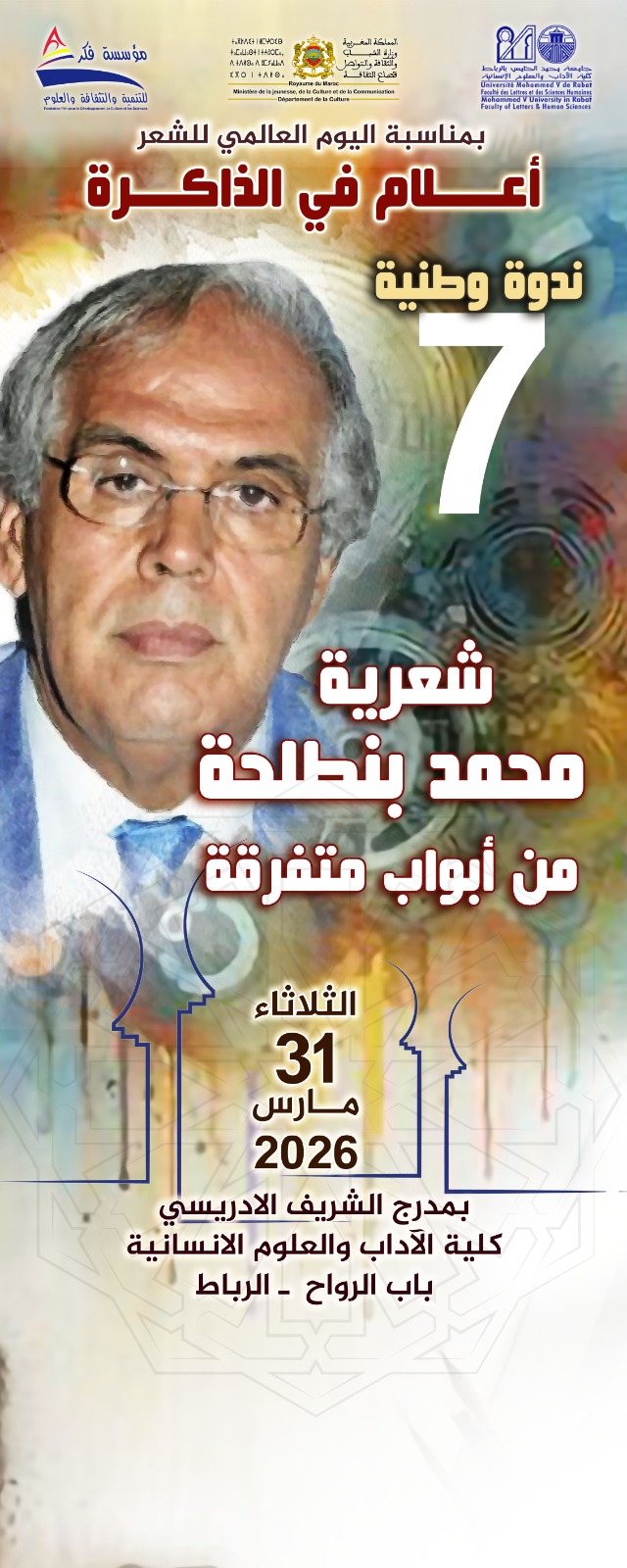 تنظم مؤسسة "فكر" للتنمية والثقافة والعلوم، بتنسيق مع كلية الآداب والعلوم الإنسانية بجامعة محمد الخامس، بمناسبة اليوم العالمي للشعر، وتحت شعار "أعلام في الذاكرة"، ندوة وطنية في دورتها السابعة مخصصة لمقاربة "شعرية محمد بنطلحة من أبواب متفرقة".