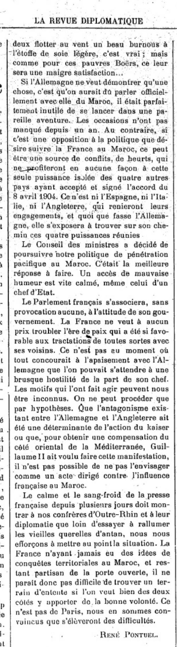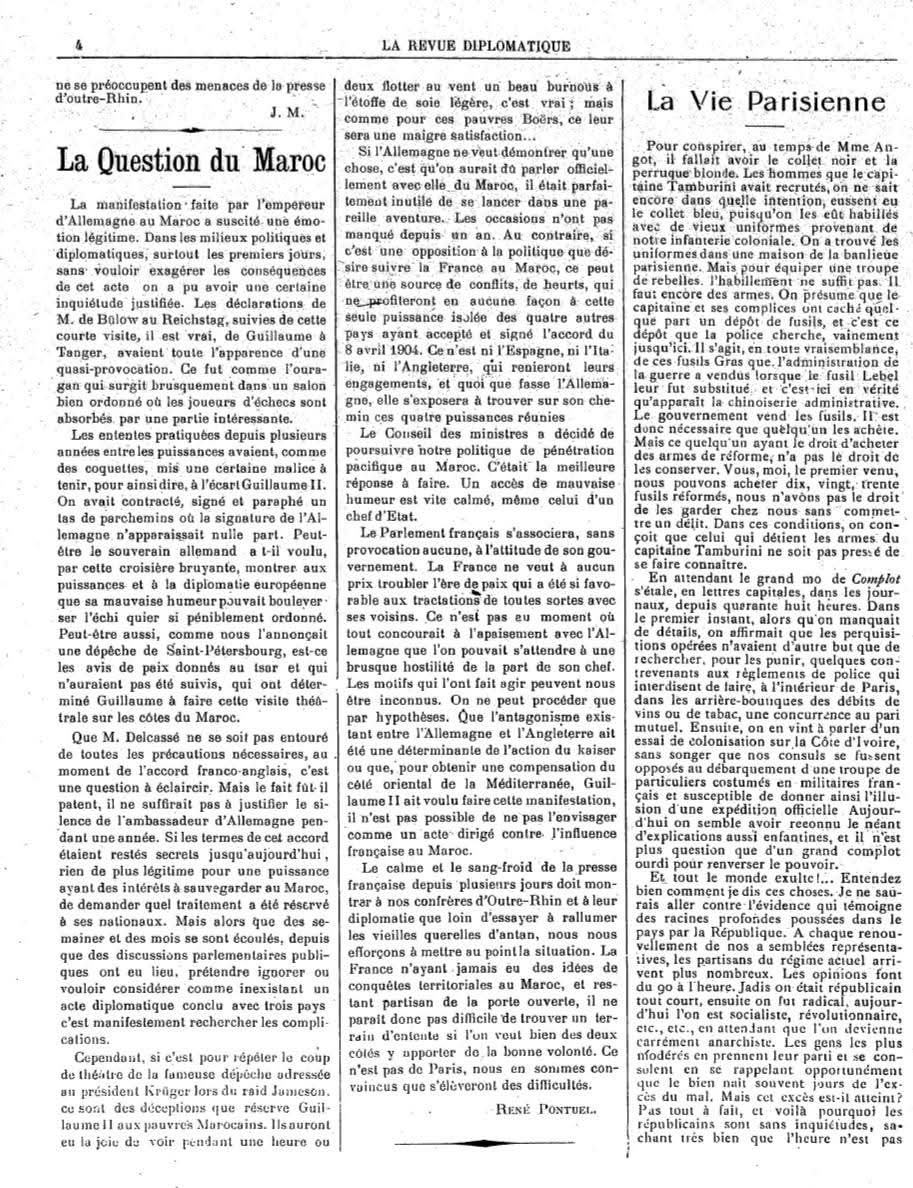 تضعنا المقالة الافتتاحية للصحافي روني بونتييل (René Pontuel)، المنشورة في "المجلة الدبلوماسية" بباريس بتاريخ 9 أبريل 1905، أمام واحدة من أدق القراءات الفرنسية المعاصرة لزيارة الإمبراطور غليوم الثاني لطنجة. فهذه الوثيقة لا تنقل الخبر فحسب، بل تعكس حالة الاستياء الدبلوماسي الفرنسي من خطوة ألمانية وُصفت بأنها "استفزازية"، وجاءت لتهدد الترتيبات التي كانت فرنسا تظن أنها حسمتها لضمان مصالحها وانفرادها بالملف المغربي.
