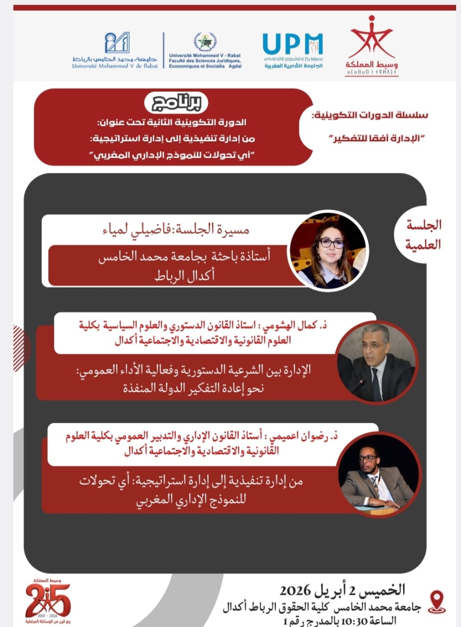 وستُعقد هذه الدورة الخميس 2 أبريل 2026 بقاعة الندوات، في سياق مواصلة جهود الجامعة في ترسيخ فضاءات الحوار الأكاديمي والتكوين المواكب لقضايا الوساطة والحكامة الجيدة.