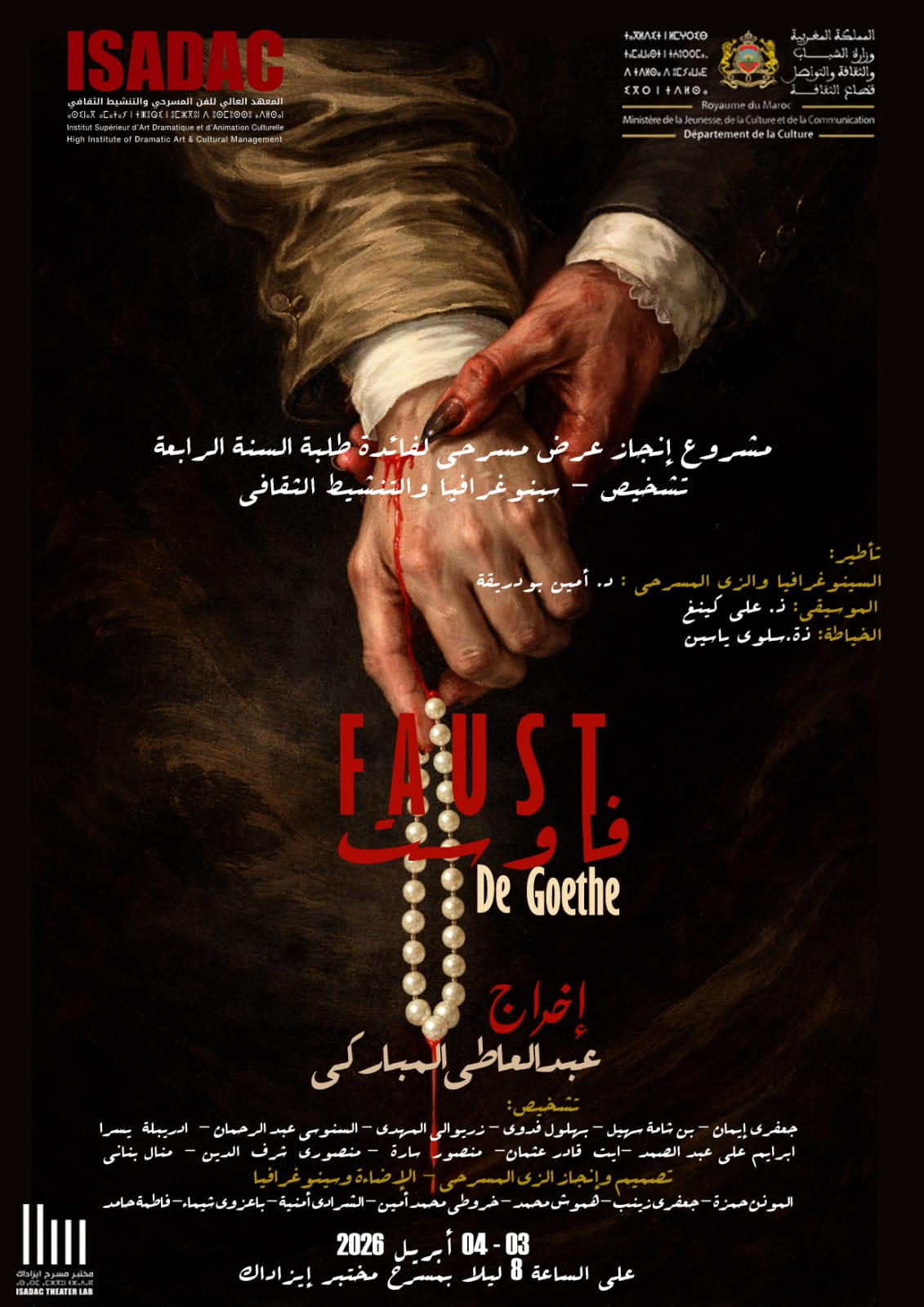 تحتضن قاعة إيزاداك تياتر لاب يومي الجمعة 03 والسبت 04 ابريل الجاري على الساعة 20h، عرض مسرحية فاوست الشهيرة من طرف طلبة السنة الرابعة تشخيص وسينوغرافيا وتنشيط ثقافي، من اخراج عبد العطي لمباركي.
