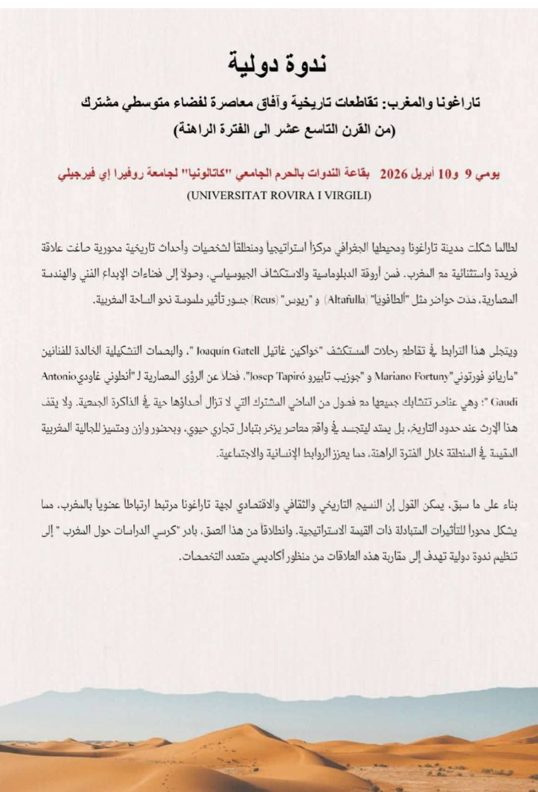 وتهدف هذه التظاهرة الأكاديمية إلى مقاربة العلاقات الثنائية من منظور متعدد التخصصات، يستحضر العمق التاريخي الذي يمتد من القرن التاسع عشر وصولاً إلى الفترة الراهنة، مع تسليط الضوء على الروابط الجيوسياسية والدبلوماسية والجمالية التي شكلت نسيجاً مشتركاً بين جهة تارغونا والمغرب.