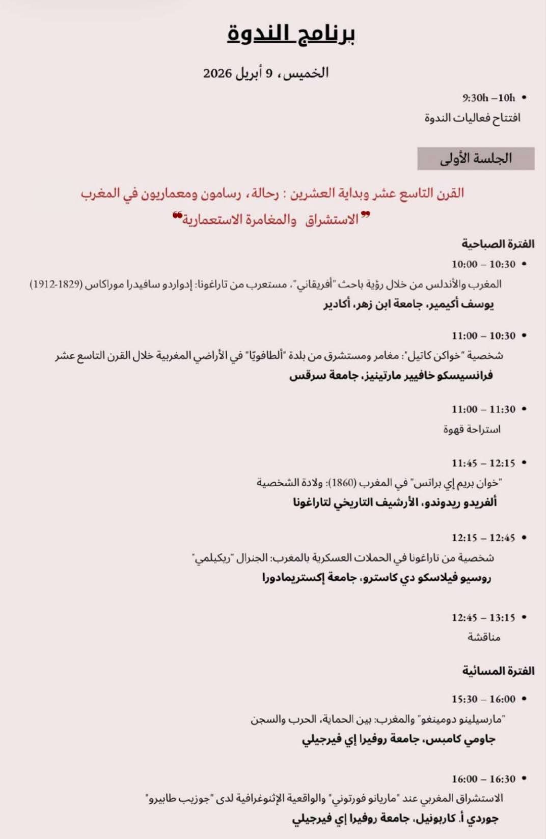 وتتوزع أشغال الندوة على جلستين رئيستين؛ تخصص الأولى لمناقشة حقبة القرن التاسع عشر وبداية القرن العشرين، مع التركيز على أدوار الرحالة والرسامين والمعماريين، ومسارات شخصيات بارزة مثل "إدواردو سافيدرا" و"خواكين غاتيل"، بالإضافة إلى استعراض التأثيرات المتبادلة في العمارة والفنون التشكيلية لدى فنانين من طينة "ماريانو فورتوني" و"جوزيب تابيرو" وأنطوني غاودي. كما تتناول الجلسة الجوانب العسكرية والبعثات الكاثوليكية، مبرزةً كيف ساهمت هذه التفاعلات في صياغة ذاكرة مشتركة تتجاوز الحدود الجغرافية.