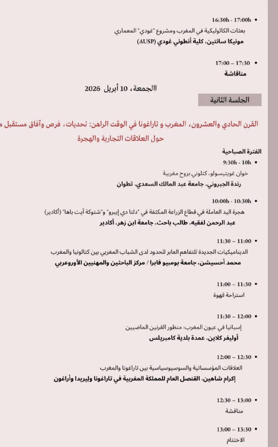 أما الجلسة الثانية، فتستشرف واقع العلاقات في القرن الحادي والعشرين، حيث ينصب النقاش على التحديات الراهنة والفرص المستقبلية المرتبطة بالتبادلات التجارية والهجرة. ويتضمن البرنامج مداخلات حول ديناميكيات التفاهم العابر للحدود لدى الشباب، وواقع اليد العاملة في قطاع الزراعة، إلى جانب تحليل العلاقات المؤسساتية والسوسيو-سياسية بين تارغونا والمغرب بحضور فاعلين أكاديميين ودبلوماسيين، من بينهم القنصل العام للملكة المغربية بتارغونا وليريدا وأراغون، وعمدة بلدية كامبريلس.
