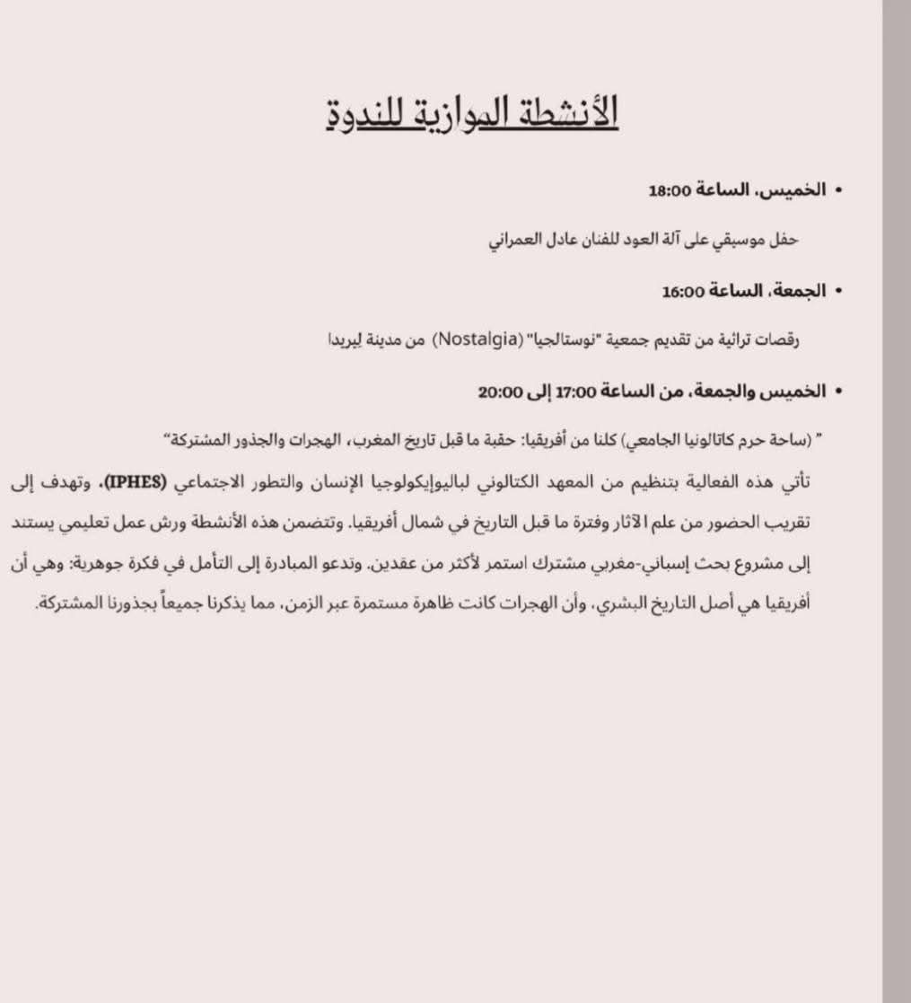وبموازاة مع الفعاليات الأكاديمية، تشهد الندوة أنشطة ثقافية غنية تشمل حفلاً موسيقياً على آلة العود للفنان عادل العمراني، وعروضاً لرقصات تراثية تقدمها جمعية "نوستالجيا".