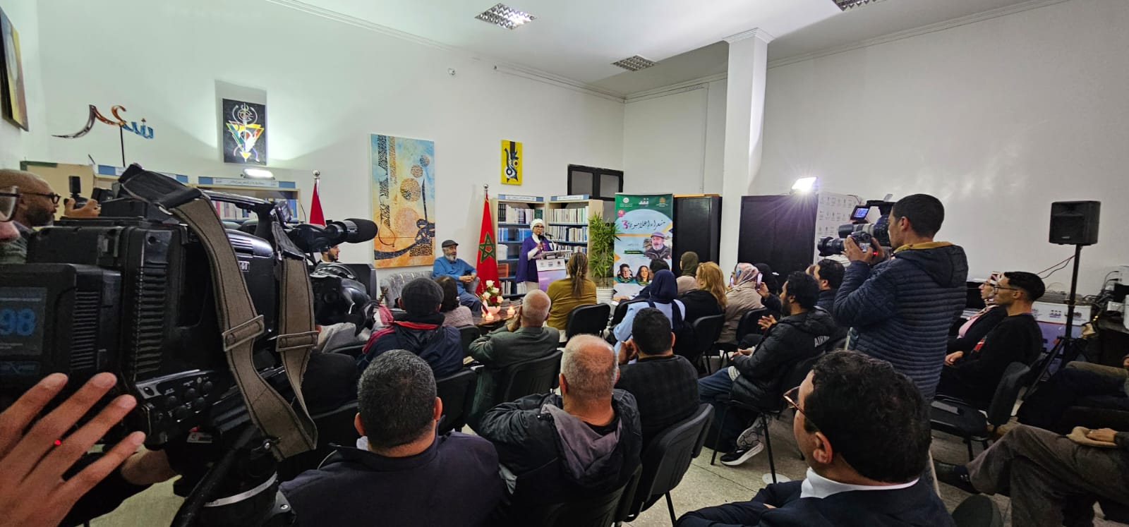 اكتست مراكش بالبياض، ليلة الجمعة الماضية، في لحظة استثنائية لم تشهدها المدينة.. وفي ليلة ماطرة بفضاء دار الشعر بمراكش التقى لفيف من الشعراء والمثقفين والفنانين والاعلاميين، يمثلون مختلف أطياف الثقافة المغربية، وضيوف من فلسطين وتونس؛ ضمن فعاليات الدورة الثالثة من برنامج الدار الشعري "شعراء إعلاميون" احتفاء بتجربة الاعلامي والشاعر عبداللطيف بنحيى وبمشاركة الشعراء والاعلاميين: فاطمة البارودي، وداد بنموسى، ومحمد بلمو.