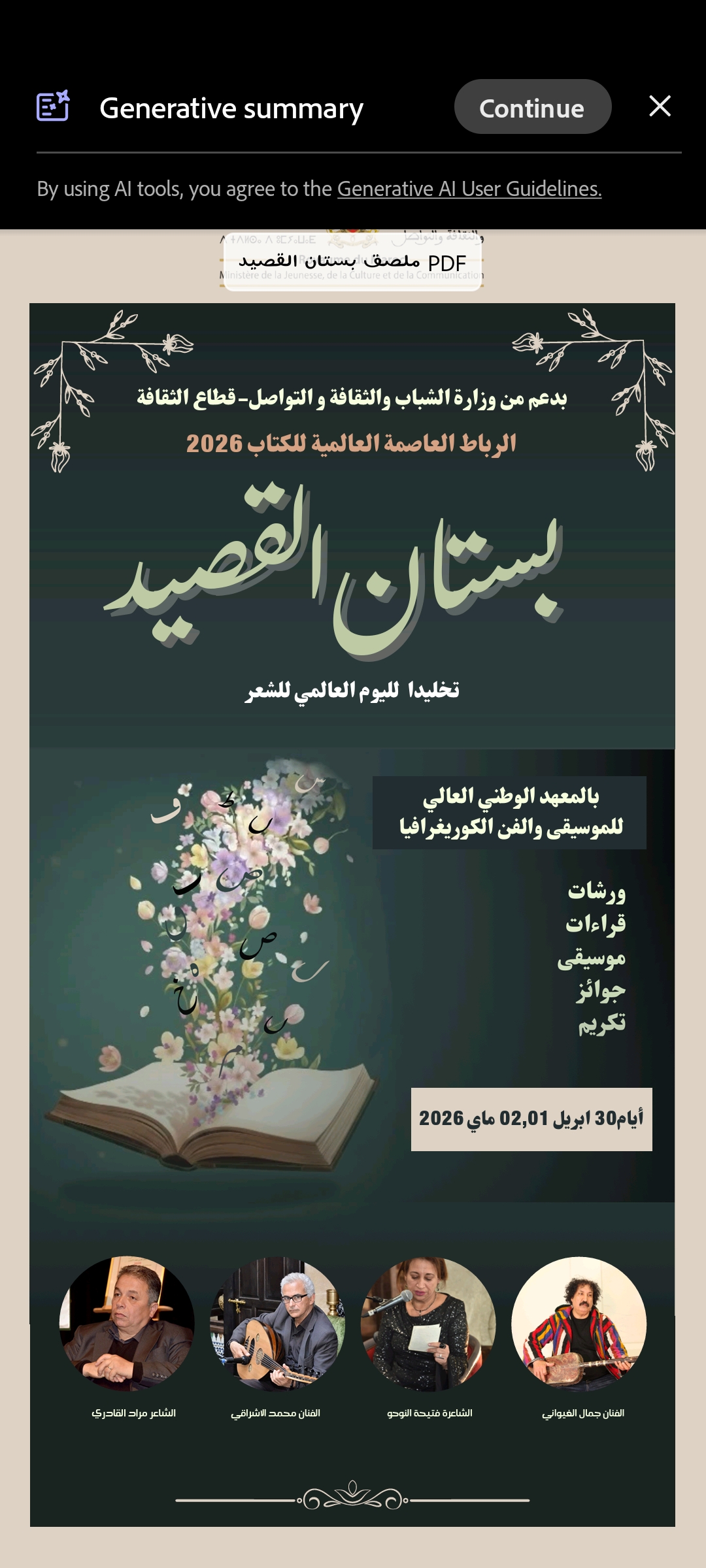 يحتضن المعهد الوطني العالي للموسيقى والفن الكوريغرافي بالرباط فعاليات الدورة الأولى لتظاهرة "بستان القصيد"، تزامناً مع فعاليات "الرباط العاصمة العالمية للكتاب 2026"، واستحضاراً للقيمة الرمزية لليوم العالمي للشعر، وذلك خلال الفترة الممتدة من 30 أبريل إلى 02 ماي 2026.