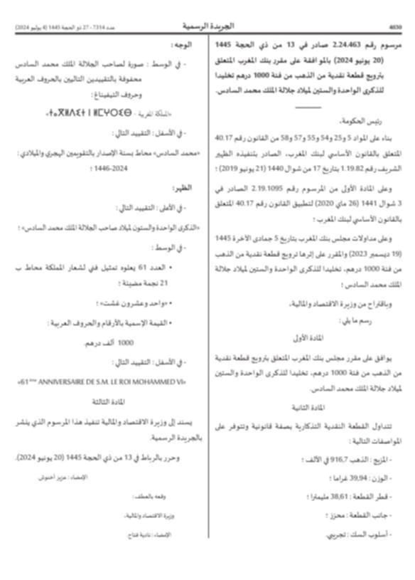 وفي الأسفل، يكتب التقييد التالي: “محمد السادس" محاط بسنة الاصدار بالتقويم الهجري والميلادي: 2024-1446.