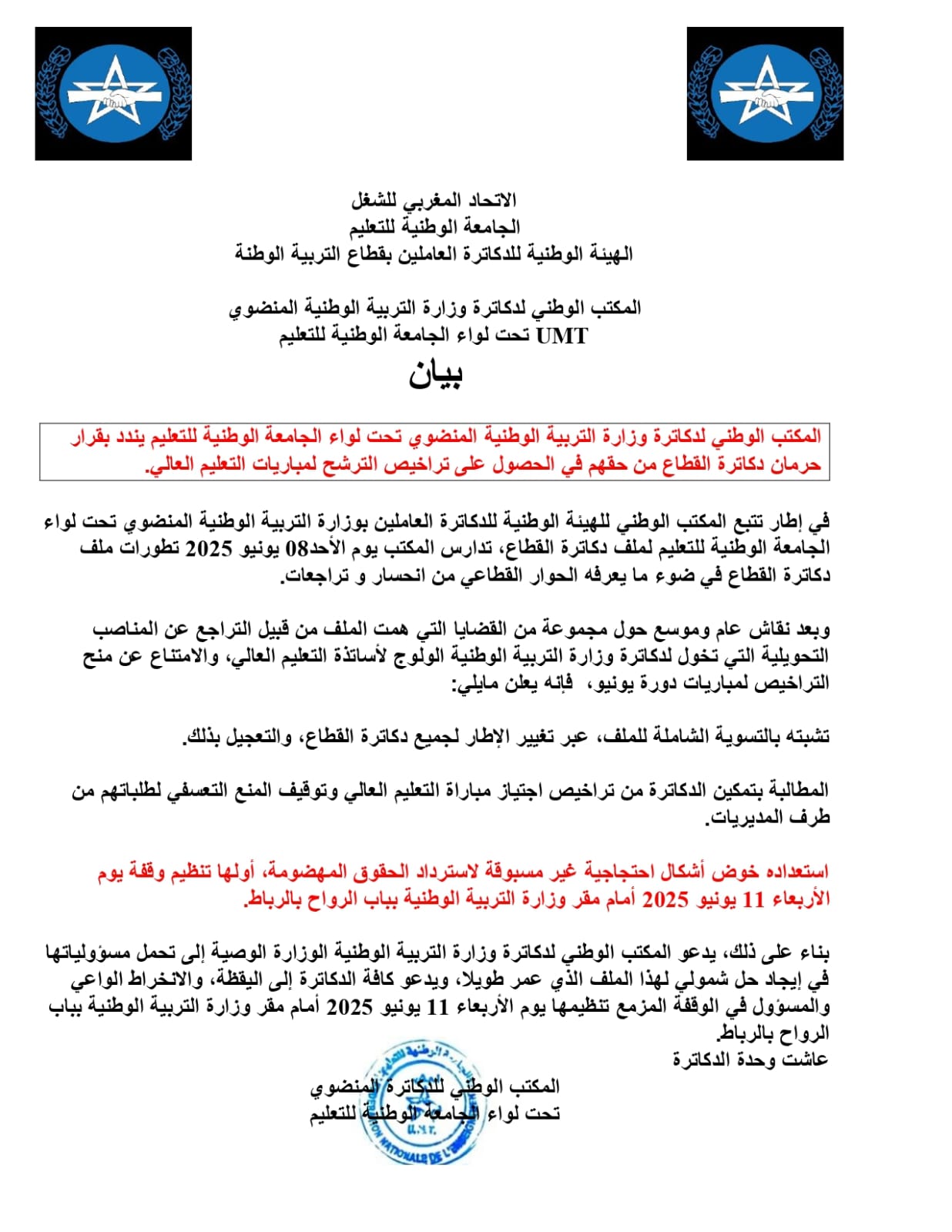 كما دعا المكتب الوطني للوزارة الوصية إلى تحمل مسؤولياتها وإيجاد حل شامل لهذه القضية التي طال أمدها، مؤكدًا على ضرورة التحرك بسرعة لتسوية ملف دكاترة وزارة التربية الوطنية.